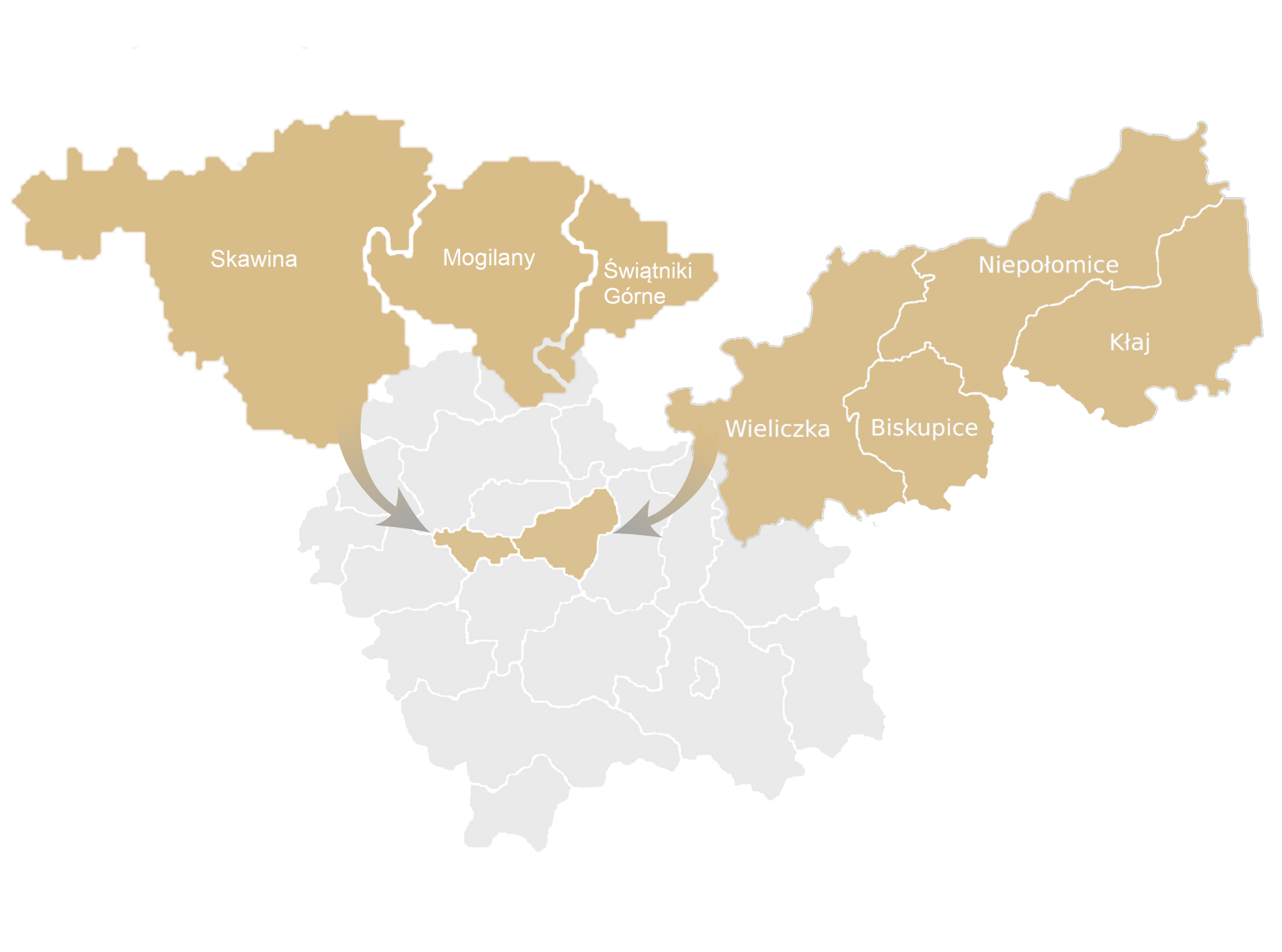 Krzęcin, Ochodza, Pozowice, Polanka Hallera, Radziszów, Rzozów, Skawina, Wielkie Drogi,